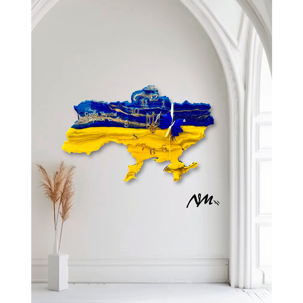 Синьо – жовтий годинник з епоксидної смоли з надписом: Слава Україні Героям Слава і з тризубом по центру. Цей витвір мистецтва наповнює простір силою і гармонією, нагадуючи тепло Батьківщини.