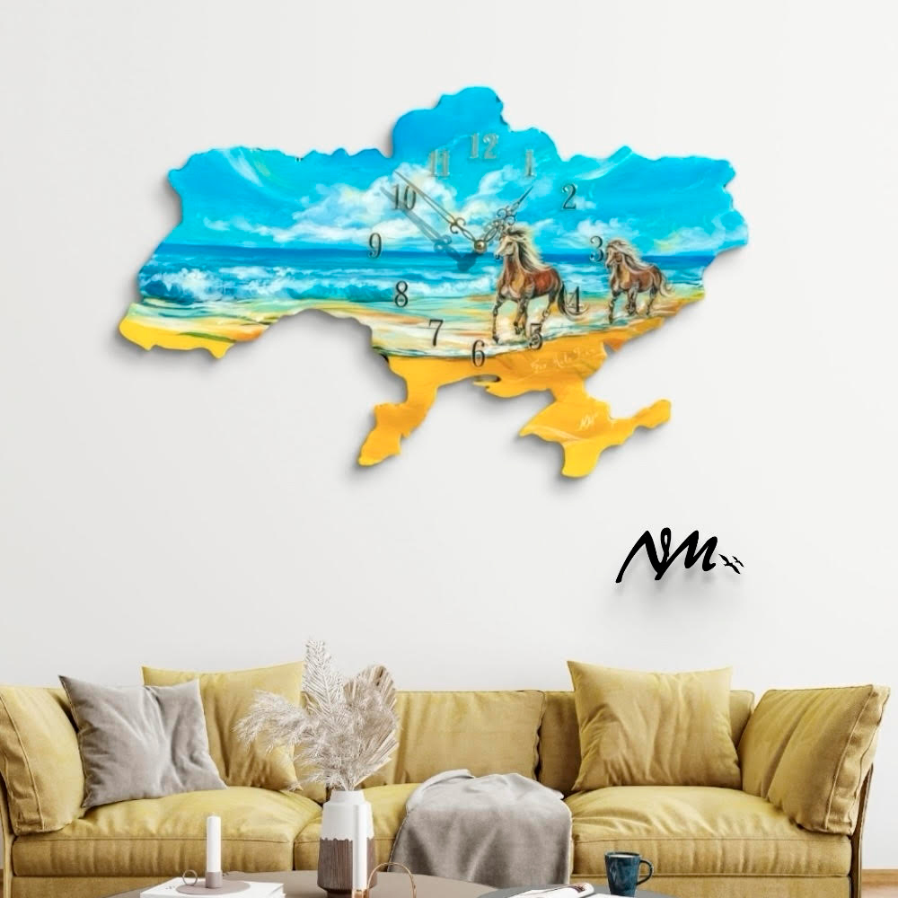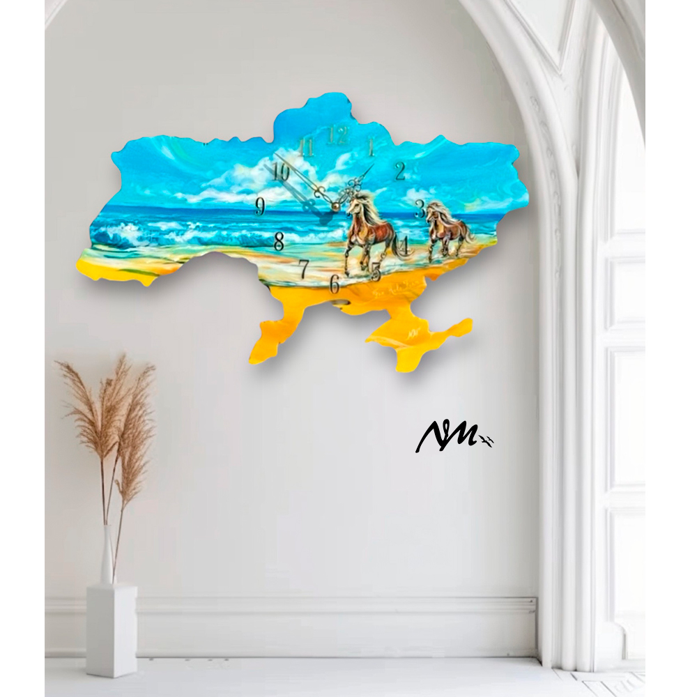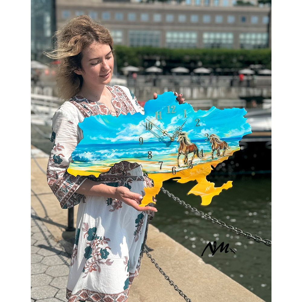Годинник з епоксидної смоли з повністю ручним розписом: ніжне блакитне небо гармонійно поєднується з глибиною безмежного океану, на березі якого граційно постають коні, що насолоджуються свободою. Цей унікальний витвір мистецтва стане символом гармонії та свободи у вашому просторі.